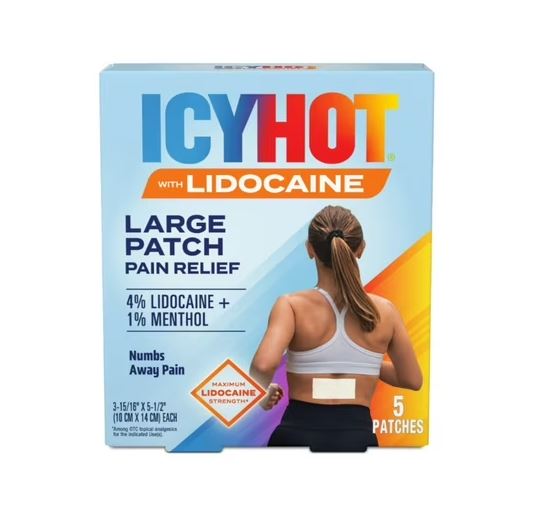 - Includes five (5) Icy Hot Max Strength Lidocaine Plus Menthol Pain Relief Patches for back and other large areas